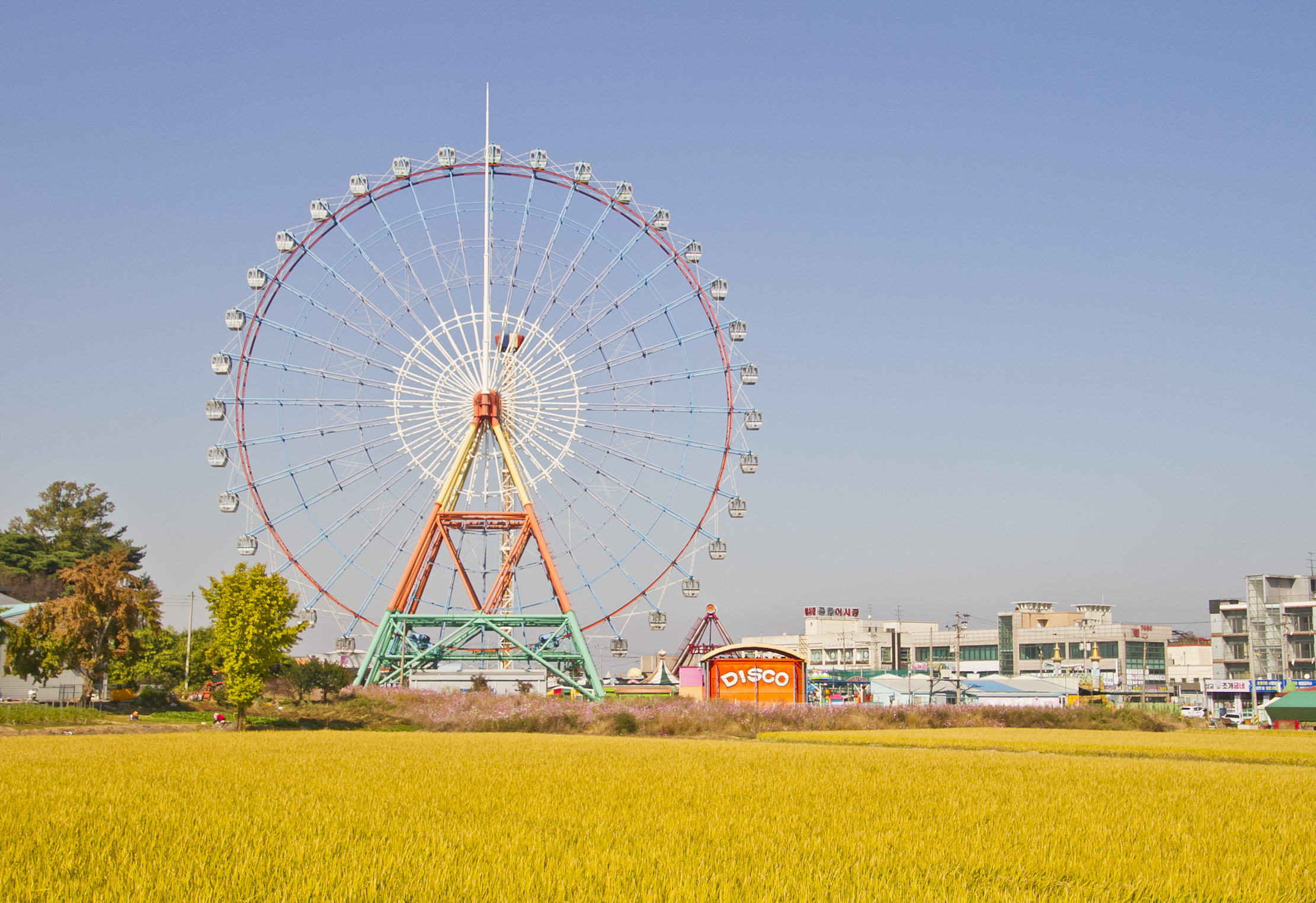 바다공원을 둘러보고 마지막으로 들른 곳은 대관람차가 잘 보이는 곳이다. 노랗게 익은 벼들 사이로 위풍당당 서 있는 대관람차. 대관람차를 타 볼 수 있는 많은 기회가 있었지만 실제 탑승까지는 이어지지 않았다. 이번에도 마찬가지였다. 운영 시간이 아닌 이유도 있었지만 나만 혼자서 타기엔 뭐랄까, 조금 아깝기도 하고 미안한 마음이 컸기 때문이다. 또 한 번 당진에 갈 기회가 있다면 주말에 가서 꼭 대관람차를 타보고 싶다. 삽교천을 떠나 인근 우렁쌈밥집에서 건강한 우렁쌈밥을 한가득 먹고 여행을 마무리했다.