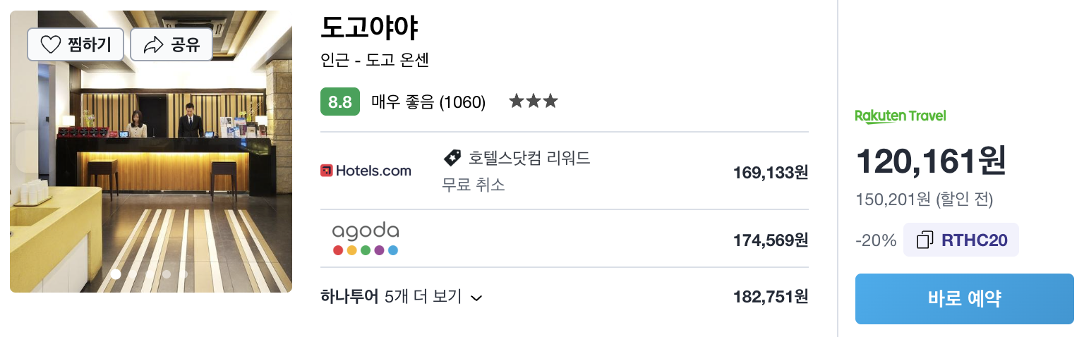 쿠폰적용 일본 숙소 검색 후 라쿠텐트래블 상품 선택