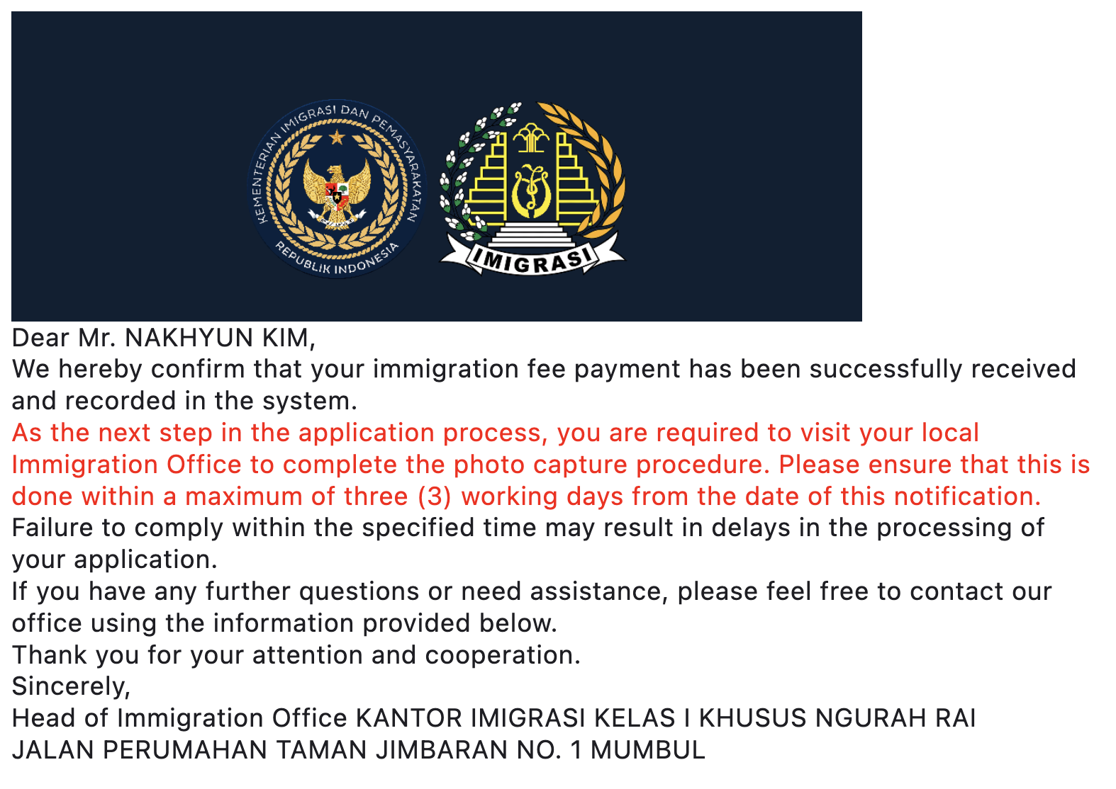 ※ 공식 이민국 사이트 주소는 evisa.imigrasi.go.id